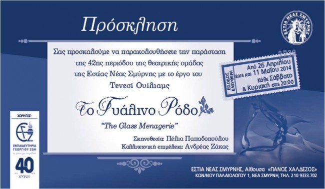 Το Σχολείο μας, πιστό στις συναντήσεις του με τον Πολιτισμό, θα αποτελέσει για δεύτερη χρονιά και τρίτη συνεχόμενη θεατρική παράσταση τον μεγάλο χορηγό της Θεατρικής Ομάδας της Εστίας Νέας Σμύρνης. Η παράσταση στην οποία θα είναι χορηγός αυτή τη φορά το Σχολείο μας είναι το πασίγνωστο αριστούργημα “Γυάλινος Κόσμος” του Αμερικανού συγγραφέα Τενεσί Ουίλιαμς. Για λόγους μετάφρασης και δικαιωμάτων το έργο έχει διασκευαστεί και ονομαστεί “Γυάλινο Ρόδο”.