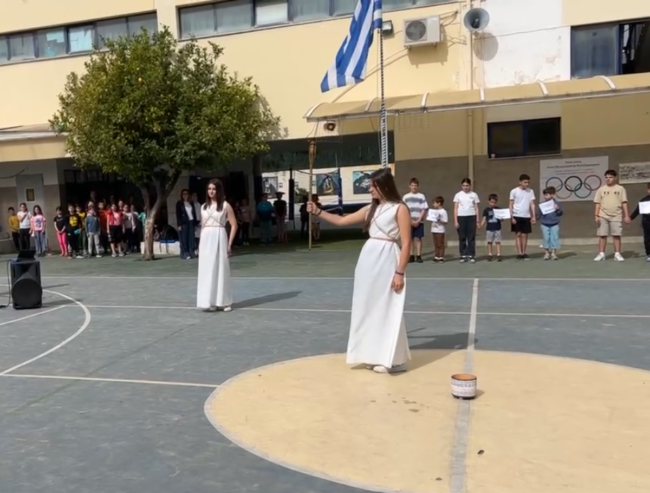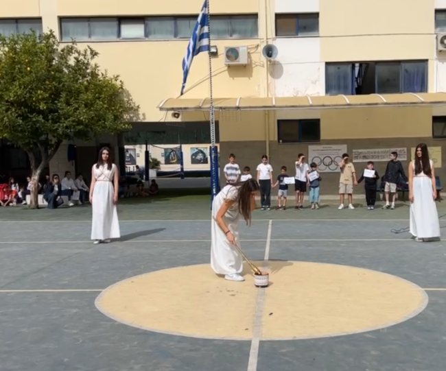 Την Τετάρτη 24 Απριλίου 2024 πραγματοποιήθηκε στον προαύλιο χώρο του Σχολείου μας αναπαράσταση της Τελετής Αφής της Ολυμπιακής φλόγας και Λαμπαδηδρομία από τους μαθητές της Α’ Γυμνασίου .