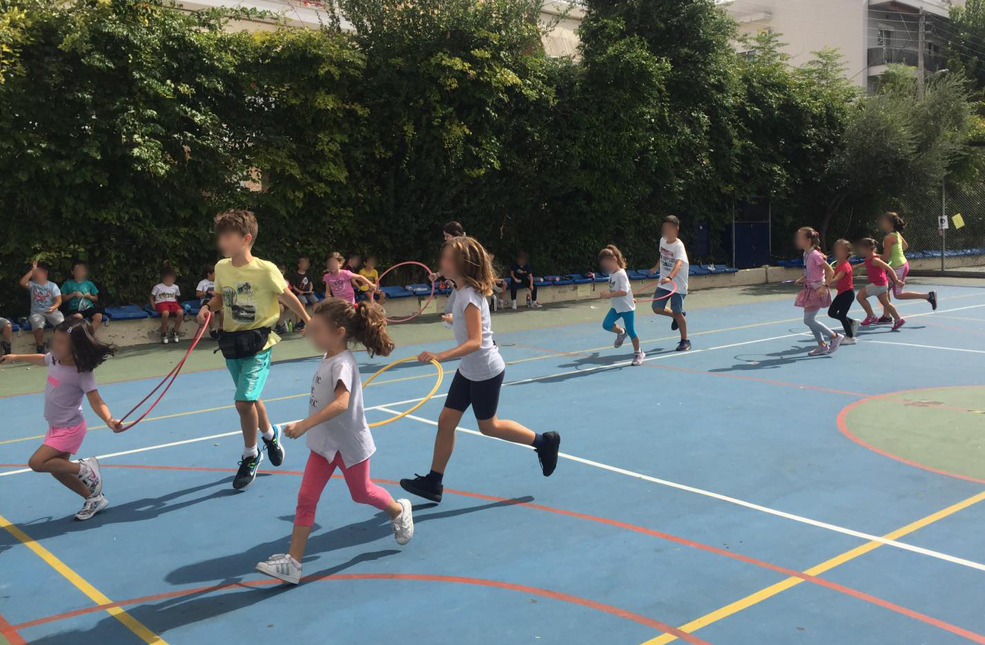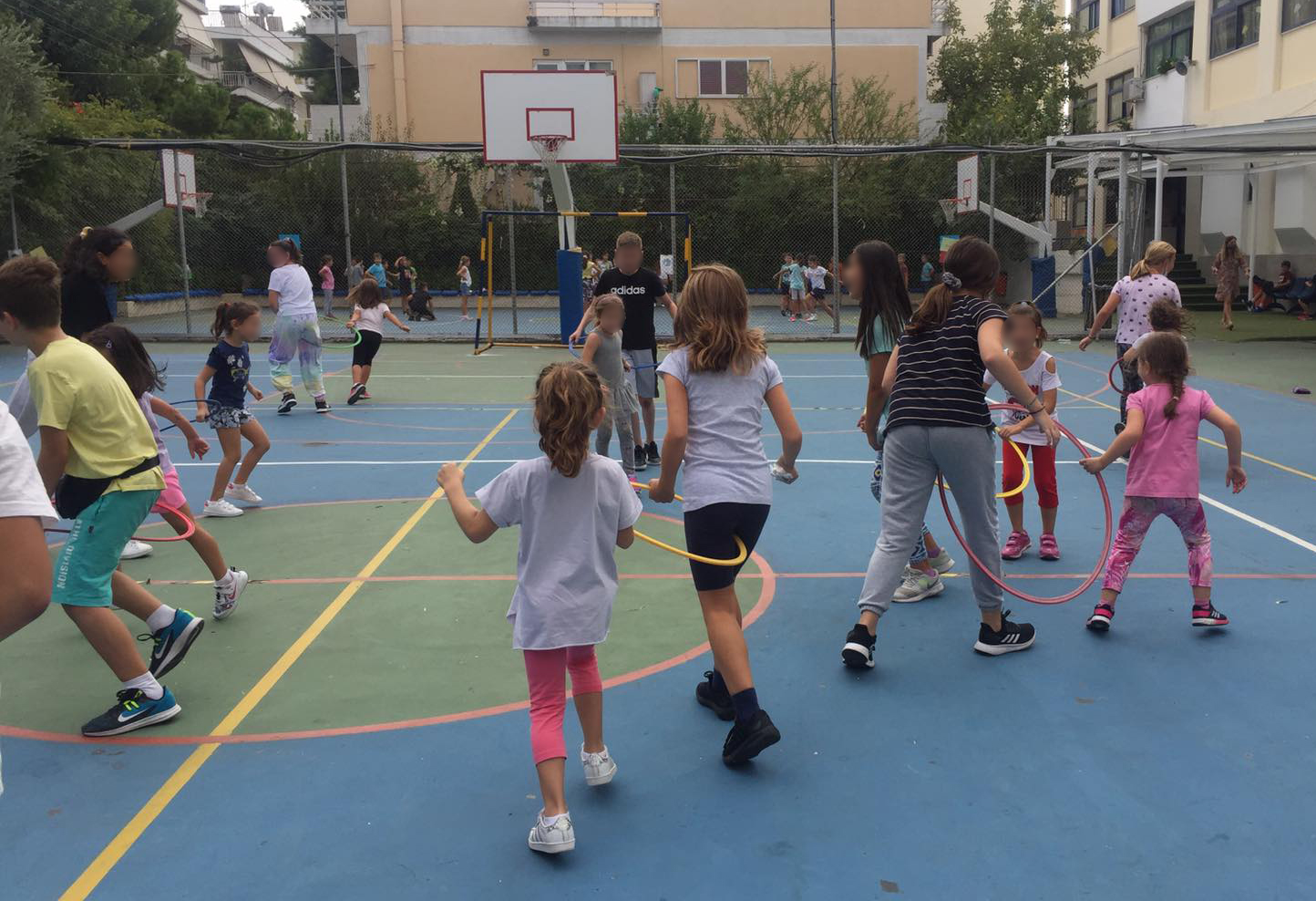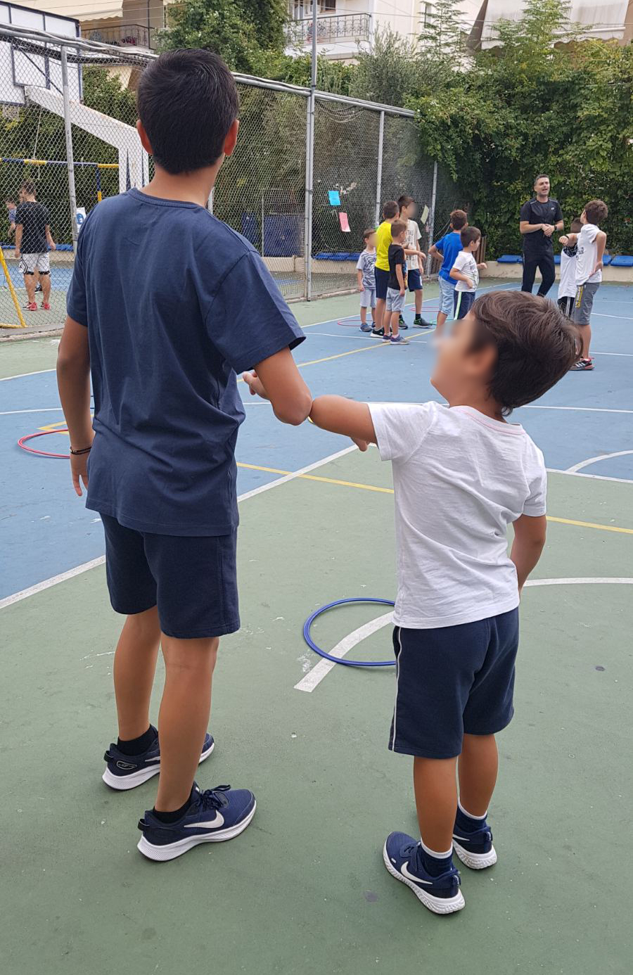 Οι μαθητές της Στ΄ Δημοτικού επισκέφτηκαν τους μαθητές της Α΄ την ώρα της Γυμναστικής και κάθε μαθητής «υιοθέτησε» ένα πρωτάκι. Έτσι, χωρίστηκαν σε ζευγάρια και έπαιξαν μαζί χρησιμοποιώντας σαν συνδετικό κρίκο ένα στεφάνι μιας που φέτος δεν μπορούσαν να πιαστούν χεράκι-χεράκι.