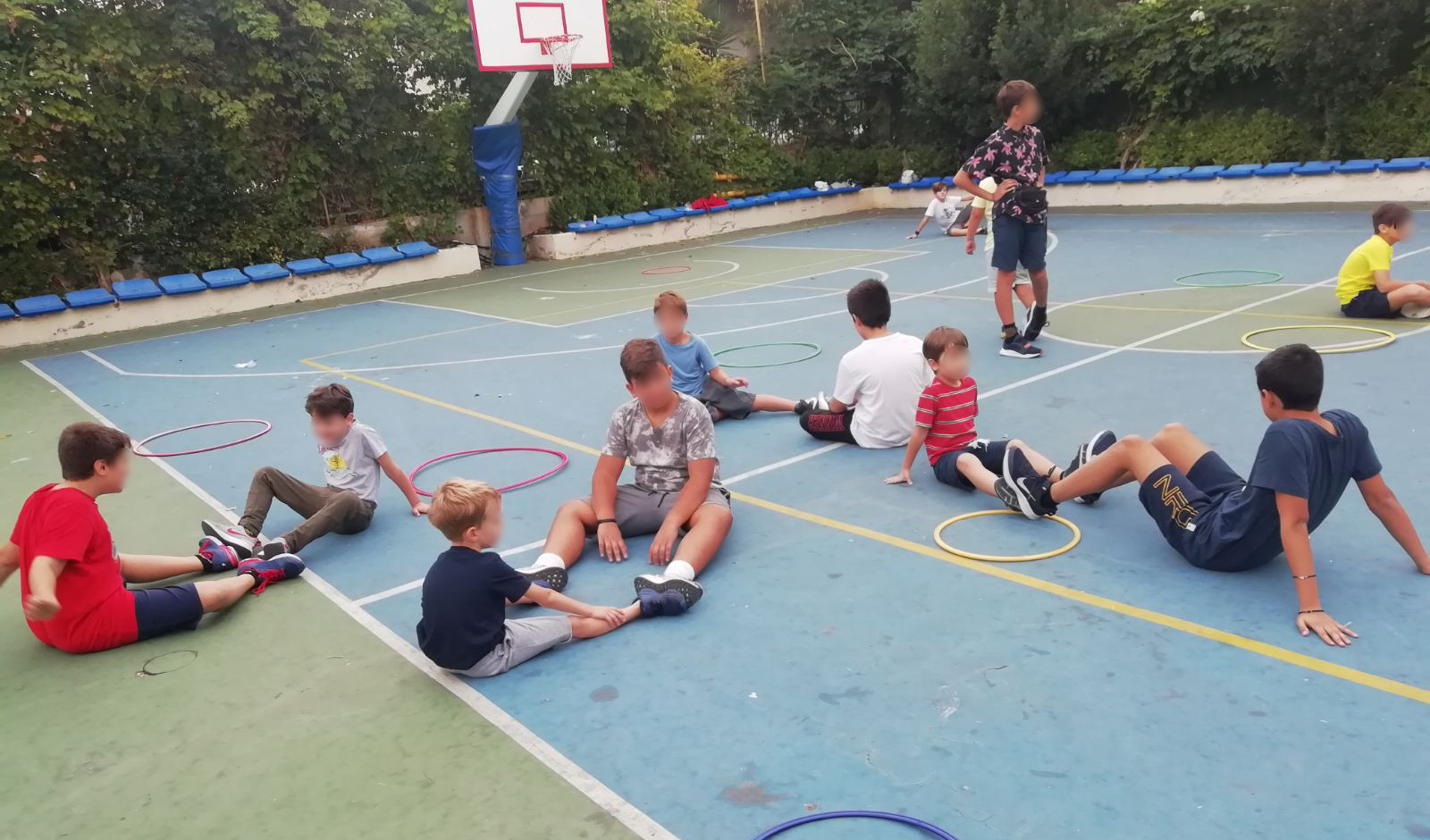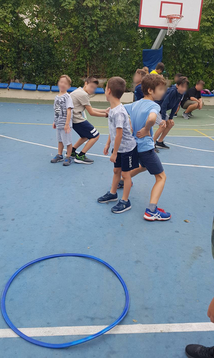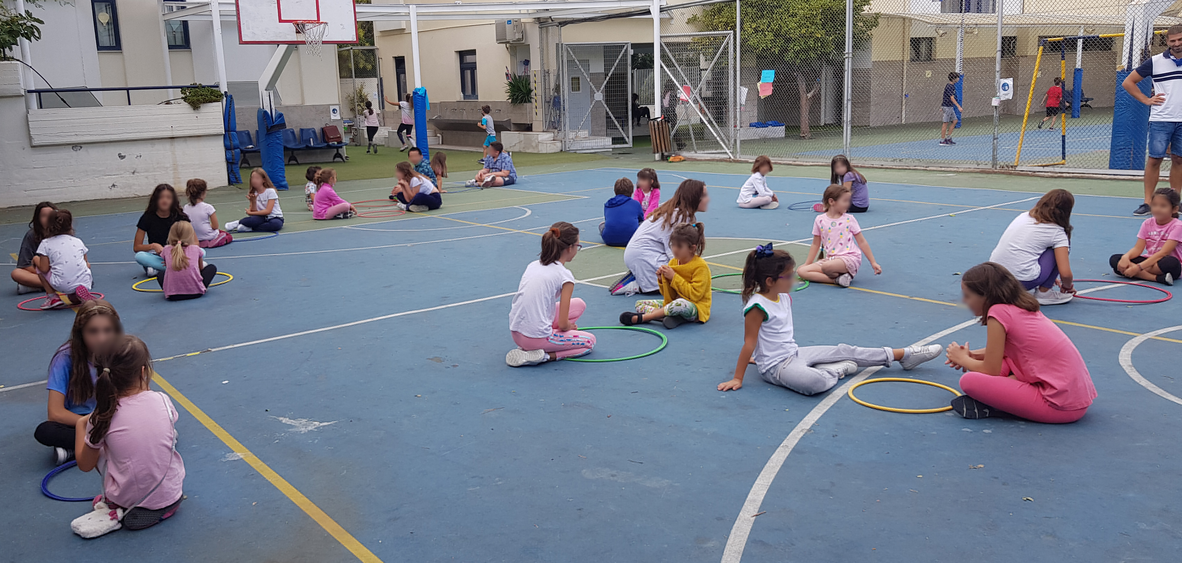 Οι μαθητές της Στ΄ Δημοτικού επισκέφτηκαν τους μαθητές της Α΄ την ώρα της Γυμναστικής και κάθε μαθητής «υιοθέτησε» ένα πρωτάκι. Έτσι, χωρίστηκαν σε ζευγάρια και έπαιξαν μαζί χρησιμοποιώντας σαν συνδετικό κρίκο ένα στεφάνι μιας που φέτος δεν μπορούσαν να πιαστούν χεράκι-χεράκι.