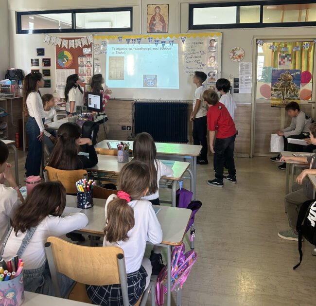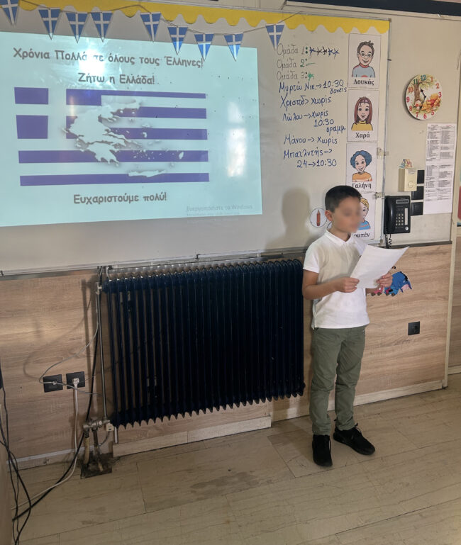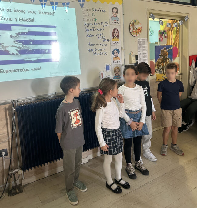 Οι μαθητές της Ε’ τάξης παρουσίασαν με ενθουσιασμό τα σημαντικά γεγονότα του 1940 και μοιράστηκαν συγκινητικές συνεντεύξεις από τους παππούδες και τις γιαγιάδες τους.Στη συνέχεια, τα παιδιά της Β’ Δημοτικού απήγγειλαν με περηφάνια τα ποιήματά τους για το «ΟΧΙ» και όλοι μαζί τραγούδησαν το αγαπημένο τραγούδι «Βάζει ο Ντούτσε τη στολή του», καθώς και άλλα επετειακά τραγούδια.