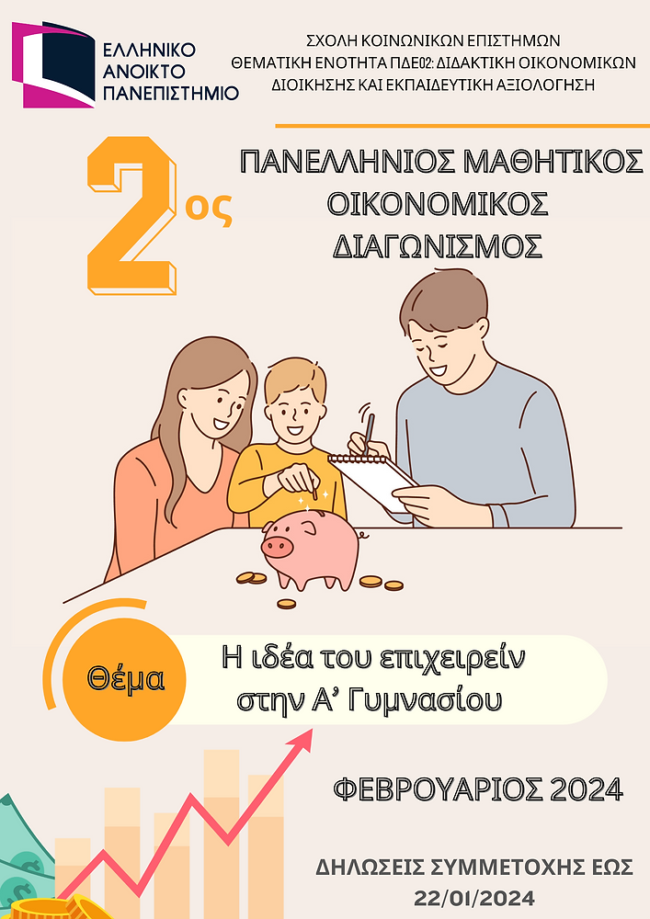 Την Τρίτη 27 Φεβρουαρίου 2024 διοργανώθηκε από το Ελληνικό Ανοικτό Πανεπιστήμιο και ειδικότερα τη Σχολή Κοινωνικών Επιστημών ο 2ος Πανελλήνιος Μαθητικός Οικονομικός Διαγωνισμός με θέμα «Η ιδέα του επιχειρείν στην Α΄ Γυμνασίου».