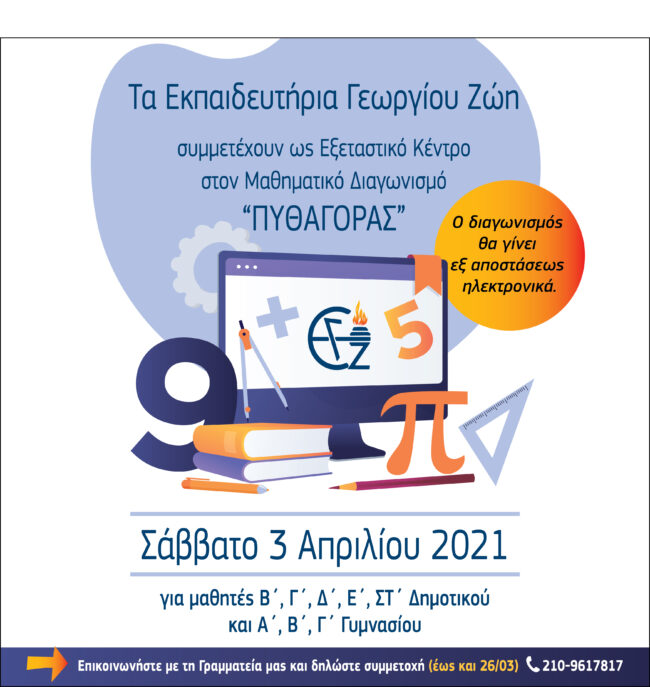 Με χαρά σας ενημερώνουμε ότι τα Εκπαιδευτήρια Γεωργίου Ζώη συμμετέχουν και φέτος ως Εξεταστικό Κέντρο στον Διαγωνισμό Μαθηματικών ικανοτήτων της Ελληνικής Μαθηματικής  Εταιρείας  «ΠΥΘΑΓΟΡΑΣ», ο οποίος αφορά μαθητές από την Β΄ τάξη Δημοτικού έως και την Γ΄ Γυμνασίου.