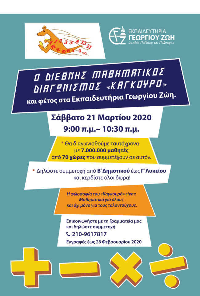 Σας ενημερώνουμε ότι το Σάββατο 21 Μαρτίου 2020 και ώρα 9.00 π.μ. (ώρα προσέλευσης 8.30 π.μ.) θα διεξαχθεί ο Διεθνής Μαθηματικός Διαγωνισμός «Καγκουρό».
