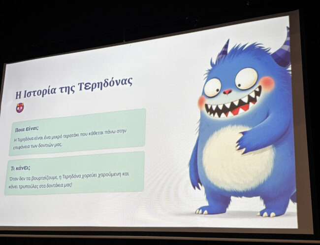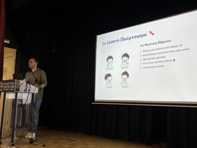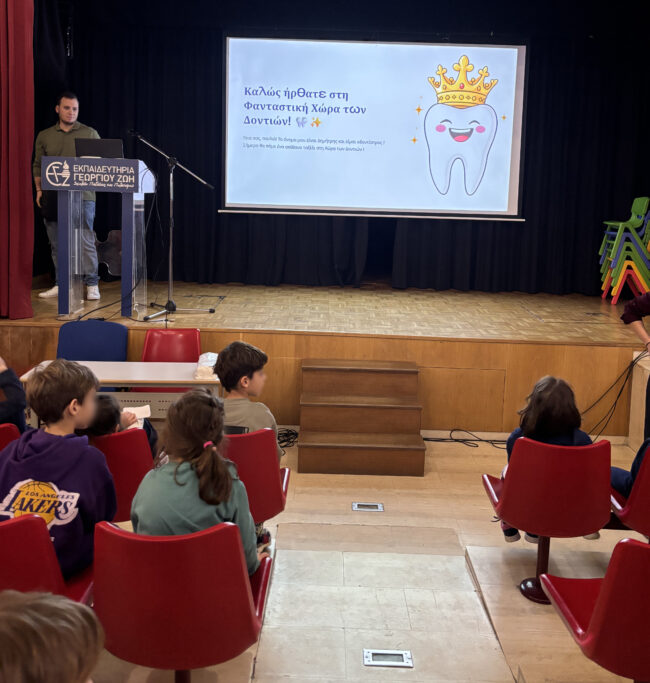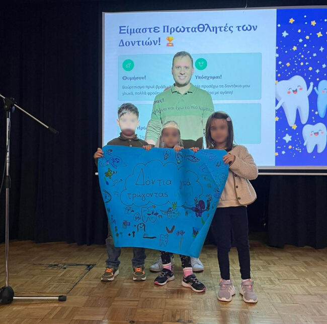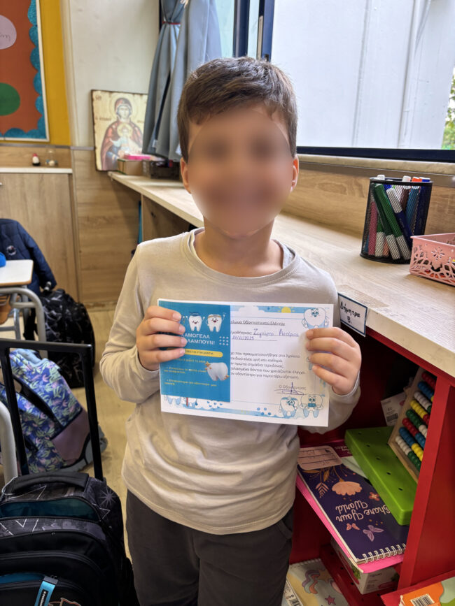 Στο τέλος, πέρασε από τις τάξεις της Α’ Δημοτικού και πραγματοποίησε έναν σύντομο προληπτικό έλεγχο, προσφέροντας χρήσιμες συμβουλές για υγιή και δυνατά χαμόγελα!