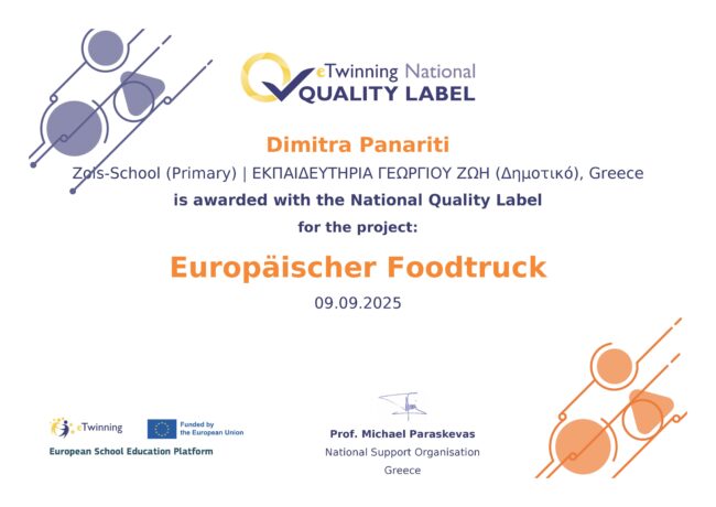 Με μεγάλη χαρά και περηφάνια ανακοινώνουμε ότι το Σχολείο μας τιμήθηκε με την Εθνική Ετικέτα Ποιότητας eTwinning για το έργο Europäischer Foodtruck στο μάθημα των Γερμανικών!