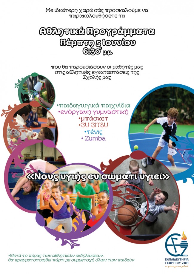 | 20.10΄-20.30΄ | Παρουσίαση Παιδαγωγικών Παιχνιδιών (Α΄ Δημοτικού) ΧΩΡΟΣ: Μικρό γήπεδο μπάσκετ |