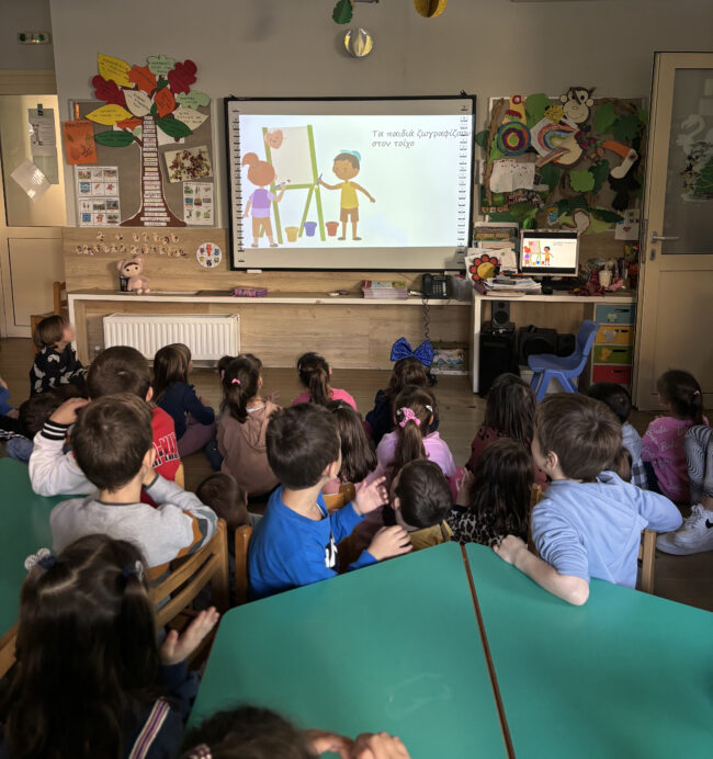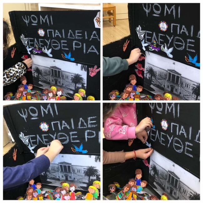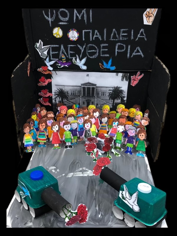 Οι μαθητές και οι μαθήτριες της Α’ Δημοτικού επισκέφτηκαν τους μικρούς τους φίλους στο Νηπιαγωγείο. Τραγούδησαν όλοι μαζί, συζήτησαν για το Πολυτεχνείο και παρακολούθησαν ένα βίντεο. Στο τέλος, βγήκαν όλοι μαζί έξω και στόλισαν με τις ζωγραφιές τους τη μακέτα του Πολυτεχνείου που είχαν ήδη ετοιμάσει τα παιδιά του Νηπιαγωγείου.