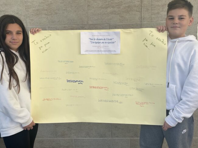 Οι μαθητές της Α’ Γυμνασίου μίλησαν για την αξία του σχολείου  και τις δυσκολίες που αντιμετωπίζουν τα παιδιά ανά τον κόσμο στον “δρόμο τους για τη Γνώση” . Τα Γαλλικά  και τα Θρησκευτικά “συναντήθηκαν” και φέτος μέσα από ένα διαθεματικό πρότζεκτ  – συνδιδασκαλία με θέμα την αξία της Εκπαίδευσης.