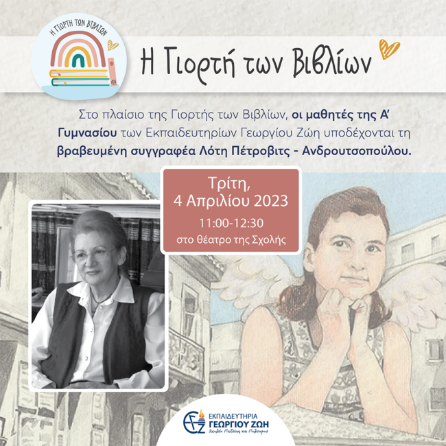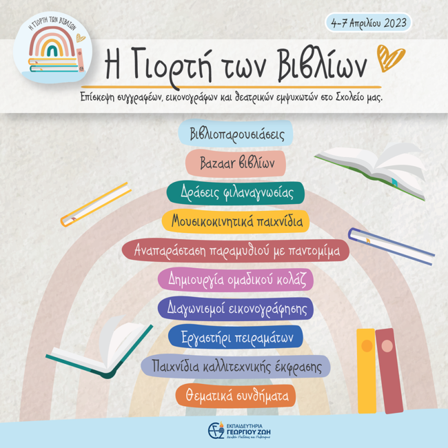 Με αφορμή την Παγκόσμια Ημέρα Παιδικού Βιβλίου, η εβδομάδα που διανύουμε είναι αφιερωμένη στο Παιδικό Βιβλίο.Οι μαθητές μας διαβάζουν βιβλία και συμμετέχουν σε ποικίλες δραστηριότητες με τους εκπαιδευτικούς τους. Παράλληλα, με μεγάλη χαρά θα υποδεχτούμε στο Σχολείο μας διακεκριμένους συγγραφείς που θα μιλήσουν στα παιδιά μας. Τέλος, θα πραγματοποιηθεί Bazaar Βιβλίων στον προαύλιο χώρο του Σχολείου, στο οποίο θα φιλοξενήσουμε βιβλία από τρεις εκδοτικούς οίκους.