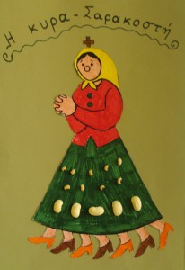 Μια κυρά – Σαρακοστή διακοσμεί την τάξη μας με σταυρωμένα τα χέρια, γιατί προσεύχεται και χωρίς στόμα, γιατί νηστεύει. Ιδιαίτερο χαρακτηριστικό της είναι τα εφτά της πόδια που συμβολίζουν τις εφτά εβδομάδες της Σαρακοστής, της περιόδου δηλαδή νηστείας 40 ημερών. Το έθιμο λέει ότι κάθε Σάββατο κόβουμε και από ένα πόδι αρχίζοντας από το Σάββατο της Καθαρής Δευτέρας και φτάνοντας ως το Μεγάλο Σάββατο, παραμονή του Πάσχα. Το τελευταίο πόδι θα το κρύψουμε μέσα σε ένα ξερό σύκο. Εκείνος λοιπόν που στο γιορτινό του πασχαλινό τραπέζι θα βρει το «τυχερό σύκο» θα έχει και τύχη την υπόλοιπη χρονιά!