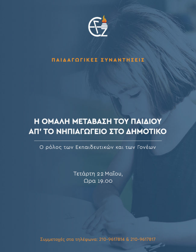 Τα Εκπαιδευτήριά μας, γνωρίζοντας και κατανοώντας τις εύλογες απορίες και ανησυχίες σας ενόψει της μετάβασης των παιδιών σας από τη μία σχολική βαθμίδα στην άλλη, διοργανώνουν Παιδαγωγική Συνάντηση με θέμα: «H ομαλή μετάβαση του παιδιού απ’ το Νηπιαγωγείο στο Δημοτικό Σχολείο – Ο ρόλος των Εκπαιδευτικών και των Γονέων».