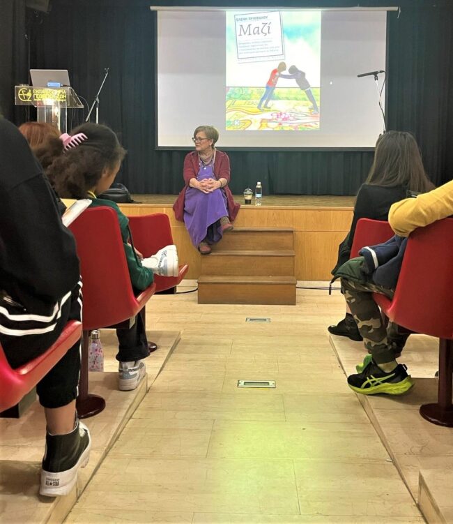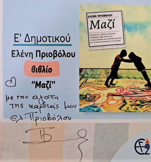 ‘’Μαζί’’ με την αξιόλογη συγγραφέα κ. Πριοβόλου Ελένη πέρασαν στιγμές οι μαθητές της Ε’ τάξης του Δημοτικού μας Σχολείου.Τα μαθήματα που δίδαξε στα παιδιά μας ήταν πολλά, τα μηνύματα από το βιβλίο της ποικίλα και εμείς ιδιαίτερα ευτυχείς που τη φιλοξενήσαμε στο θέατρο των Εκπαιδευτηρίων στο πλαίσιο της Γιορτής των Βιβλίων.