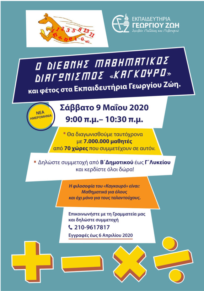 Σας ενημερώνουμε ότι ο Μαθηματικός Διαγωνισμός Καγκουρό μετατίθεται από τις 21 Μαρτίου 2020 για το Σάββατο, 9 Μαΐου 2020, ώρα 9.00 π.μ., έπειτα από επίσημη ανακοίνωση των διοργανωτών για την αντιμετώπιση της εξάπλωσης της επιδημίας του κορωνοϊού.