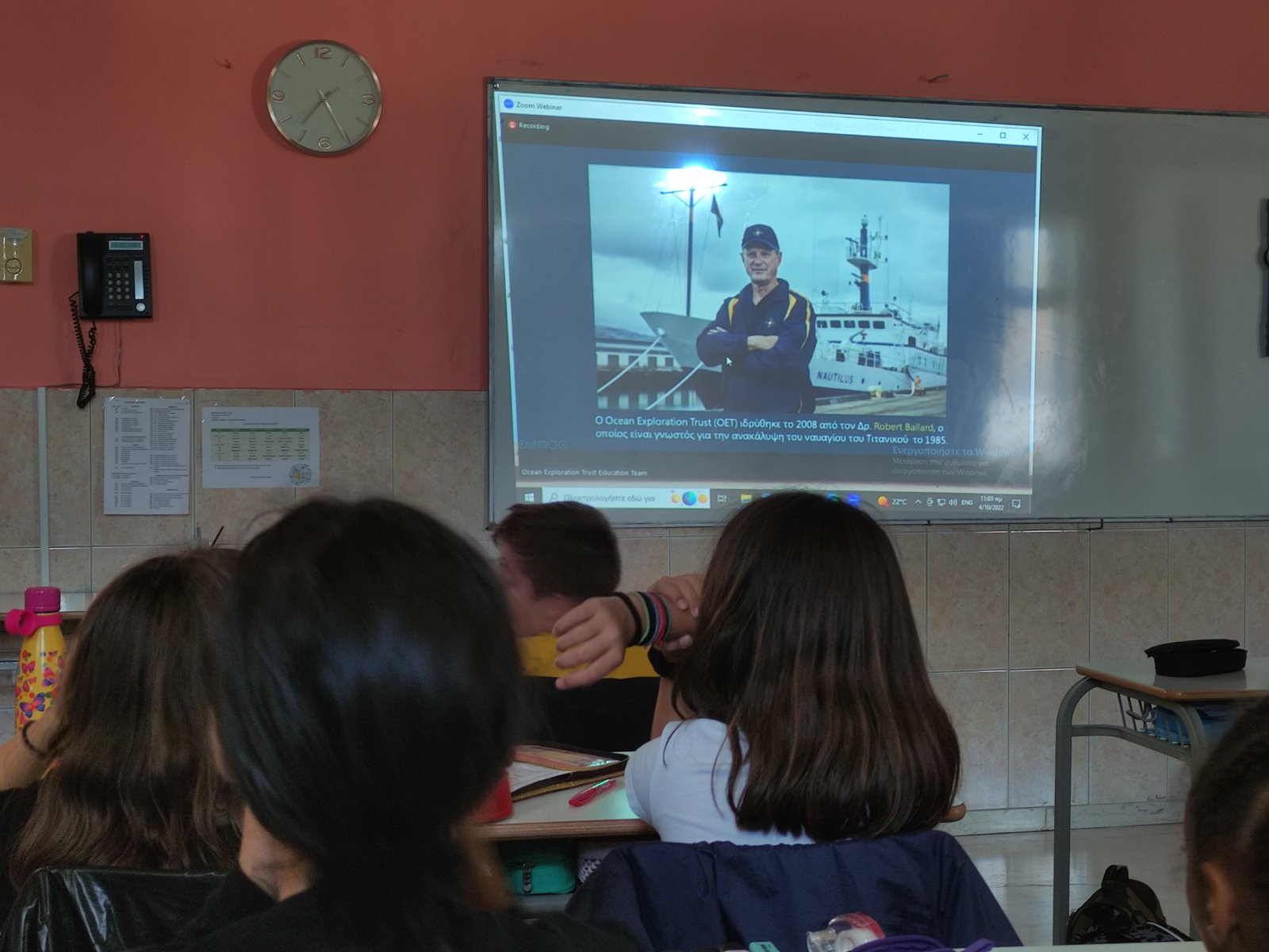 Οι μαθητές και οι μαθήτριες της Ε’ Δημοτικού συμμετείχαν σε ενημερωτική παρουσίαση, που πραγματοποιήθηκε από τον εξερευνητή Δρ. Θοδωρή Αναγνωστόπουλο, ο οποίος συμμετέχει σε ωκεανογραφική αποστολή του National Geographic και του Ocean Exploration Trust.