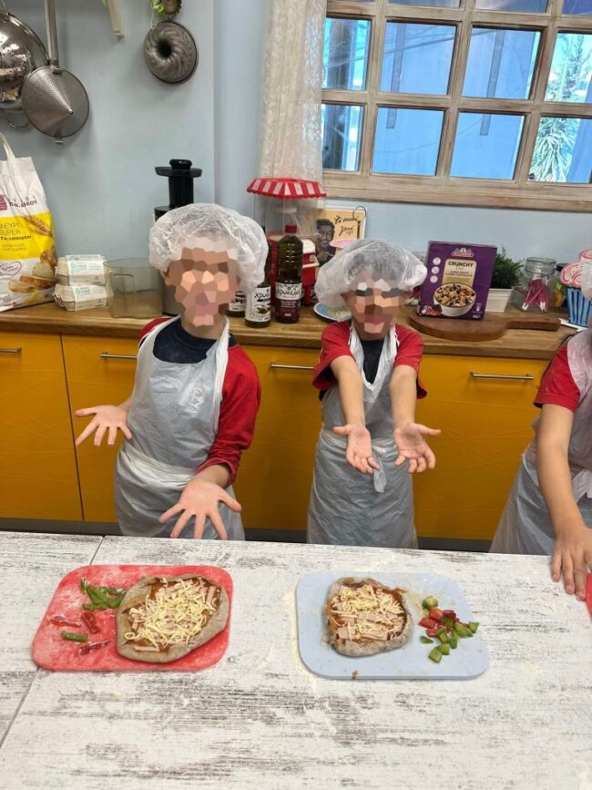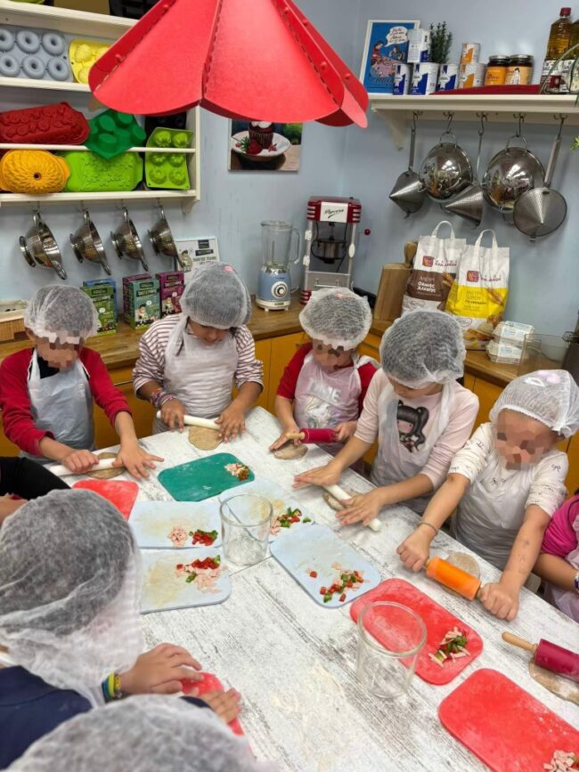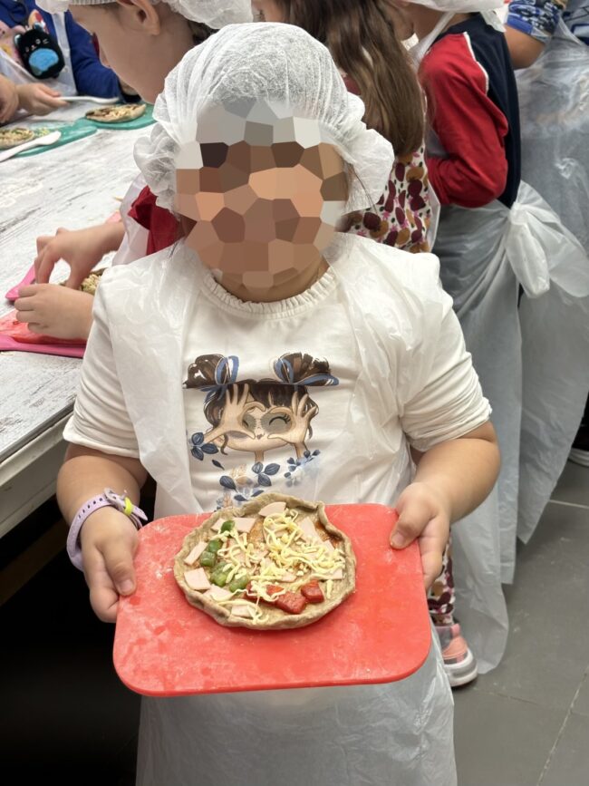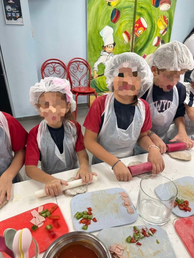 Oι μαθητές της Α’ Δημοτικού επισκεφθήκαμε το Kids cooking club, την πρώτη σχολή μαγειρικής για παιδιά στην Ελλάδα! Εκεί, αφού φορέσαμε στους σκούφους και τις ποδιές μας, γίναμε μικροί σεφ και δημιουργήσαμε παρέα αυθεντικά ιταλικά πιτσάκια! Ζυμώσαμε και φτιάξαμε μια νόστιμη και υγιεινή γέμιση από λαχανικά, γαλοπούλα και τυράκι. Μάθαμε, έτσι, πώς να δημιουργούμε ένα γρήγορο και θρεπτικό σνακ για όλη την οικογένεια!