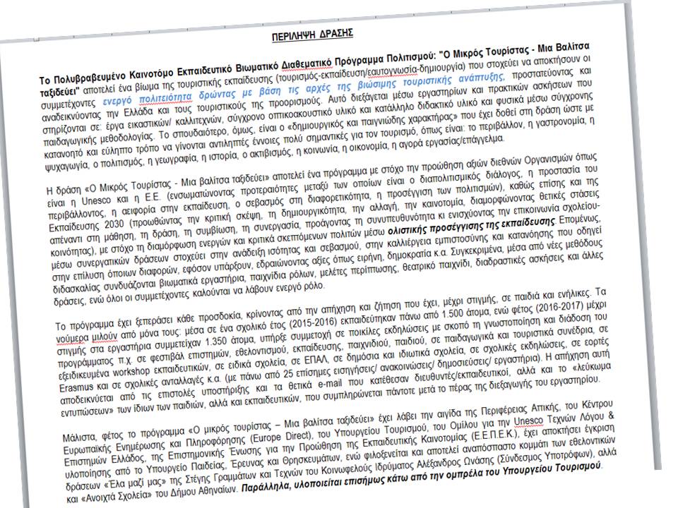 Ο στόχος του πολυβραβευμένου διαθεματικού προγράμματος ήταν να αποκτήσουν οι μαθητές τουριστική συνείδηση, προβαίνοντας σε ενεργό πολιτειότητα δηλαδή δρώντας με βάση τις αρχές της αειφορίας, προστατεύοντας και αναδεικνύοντας την Ελλάδα και τους τουριστικούς της προορισμούς.