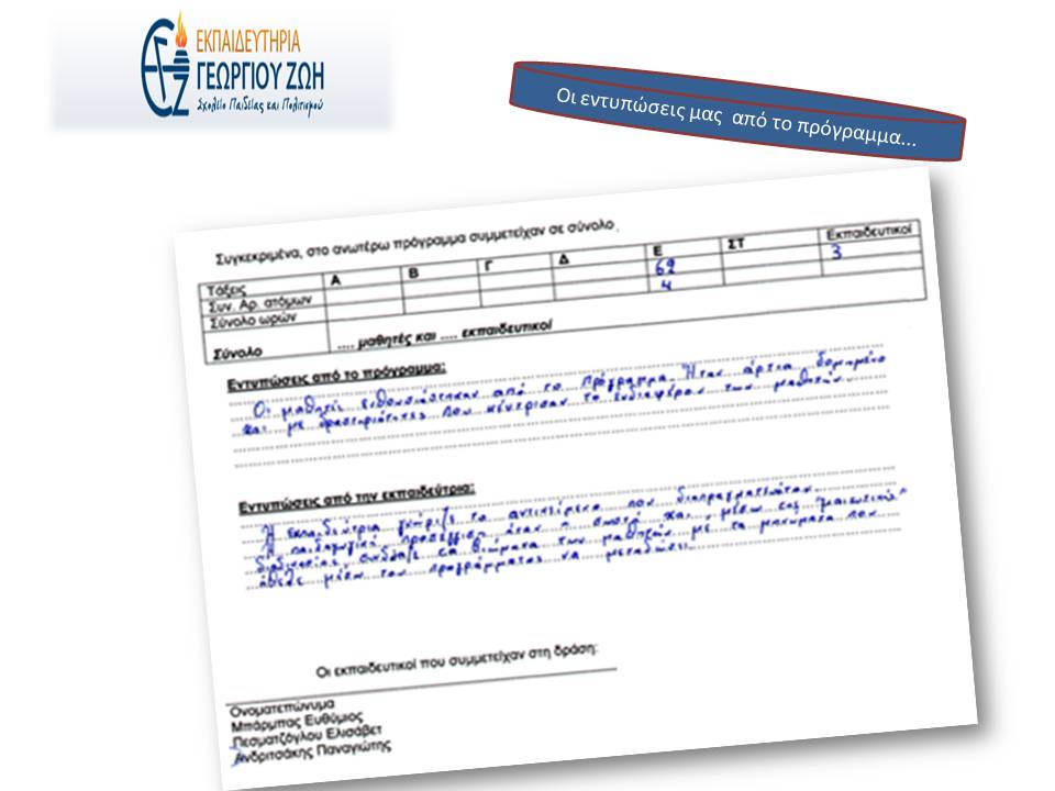 Ευχαριστούμε πολύ την κα Ελευθερία Γκρίμπα, δημιουργό και εθελόντρια εκπαιδεύτρια της δράσης, για την μοναδική εμπειρία που ζήσαμε!