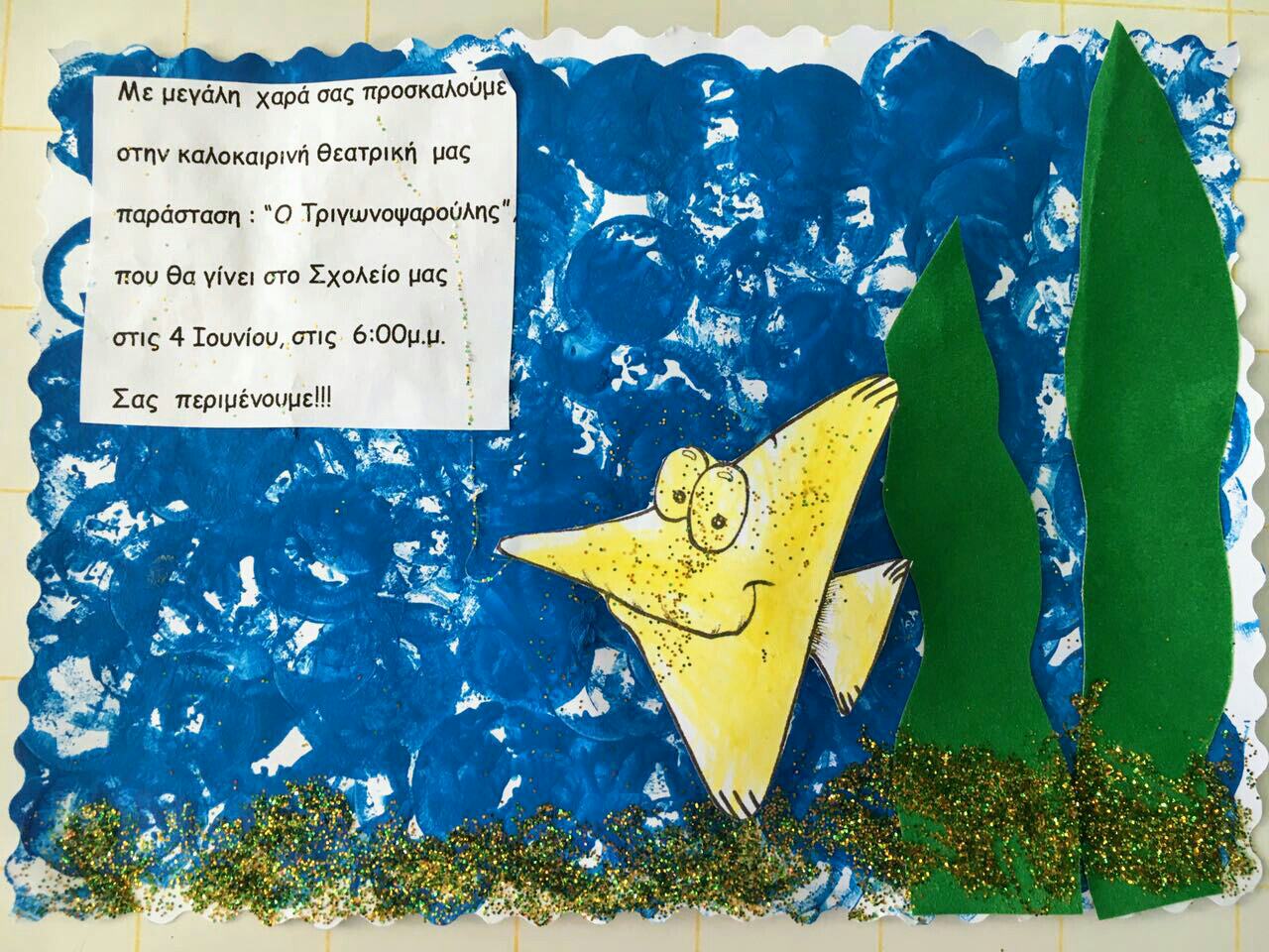 Με μεγάλη μας χαρά σας προσκαλούμε στην καλοκαιρινή μας γιορτή : “Ο Τριγωνοψαρούλης” που θα παρουσιάσουν οι μαθητές των τμημάτων του Προνηπίου ΠΡΝ4,ΠΡΝ5 στο Θέατρο του Σχολείου μας στις 4 Ιουνίου,στις 6:00μ.μ.