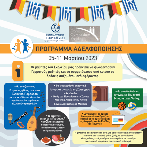 Τα Εκπαιδευτήρια Γεωργίου Ζώη με μεγάλη χαρά ανοίγουν τις πόρτες τους για να υποδεχτούν μαθητές από το DomGymnasium, το οποίο βρίσκεται στο Freising της Γερμανίας, στο πλαίσιο του προγράμματος αδελφοποίησης των δύο σχολείων.