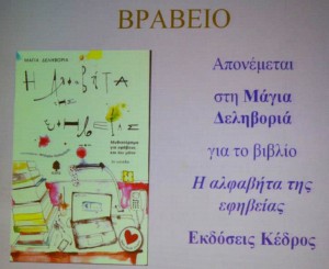 Το Σχολείο μας για μια ακόμη φορά αισθάνεται υπερήφανο, γιατί μεταξύ αυτών το πρώτο βραβείο στην κατηγορία νεανικού ή εφηβικού βιβλίου απονεμήθηκε στην καθηγήτρια της Θεατρικής Αγωγής Μάγια Δεληβοριά, για το πρωτοποριακό μυθιστόρημά της «Η Αλφαβήτα της Εφηβείας».