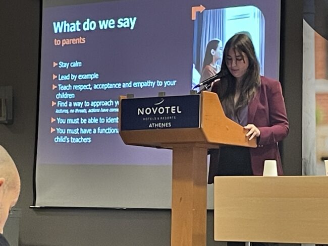 Η μαθήτρια της Γ’ γυμνασίου του σχολείου μας Μανέτου Ισαβέλλα έλαβε μέρος στο Διεθνές Συνέδριο Του Χαμόγελου του παιδιού με θέμα «Προλαμβάνοντας και αντιμετωπίζοντας τον σχολικό εκφοβισμό και τη βία μεταξύ ανηλίκων». Η Ισαβέλλα είναι εθελόντρια στο «Χαμόγελο του Παιδιού» και η μικρότερη ηλικιακά ομιλήτρια σε Διεθνές Συνέδριο.