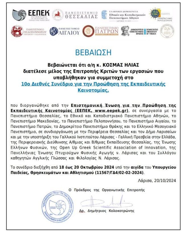 Ο κ. Κοσμάς Ηλίας, Διευθυντής του Απογευματινού και Θερινού Σχολείου των Εκπαιδευτηρίων μας, συμμετείχε ως μέλος της επιτροπής κριτών εργασιών που υποβλήθηκαν στο 10ο Διεθνές Συνέδριο για την Προώθηση της Εκπαιδευτικής Καινοτομίας. Το συγκεκριμένο συνέδριο διεξήχθη σε συνεργασία με τα Πανεπιστήμια Αθηνών, Θεσσαλίας, Πελοποννήσου, Αιγαίου και του Ελληνικού Μεσογειακού Πανεπιστημίου.