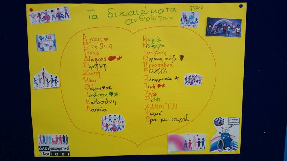 Οι μαθητές της Β΄ Δημοτικού ένωσαν τα χέρια τους σε μια μεγάλη αγκαλιά! Αγκάλιασαν τα παιδιά όλου του κόσμου, προβληματίστηκαν για την αδικία και ανισότητα που παρατηρούν γύρω τους και συμφώνησαν πως δε θα επιτρέψουν να συνεχιστεί αυτό. Σέβομαι το διαφορετικό, σέβομαι τα δικαιώματα όλων των ανθρώπων, σέβομαι τον συνάνθρωπό μου, σέβομαι τον εαυτό μου!