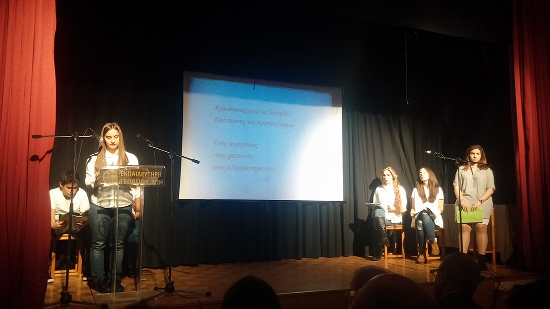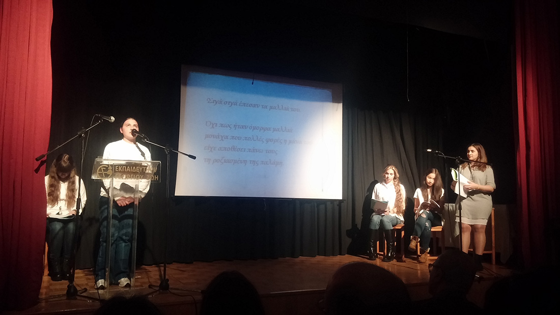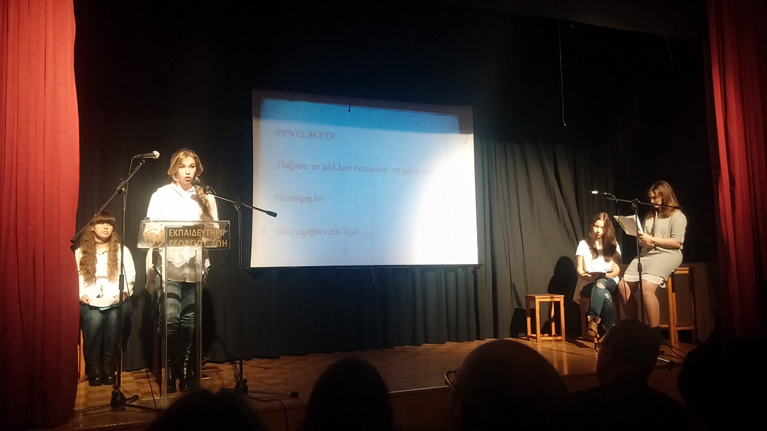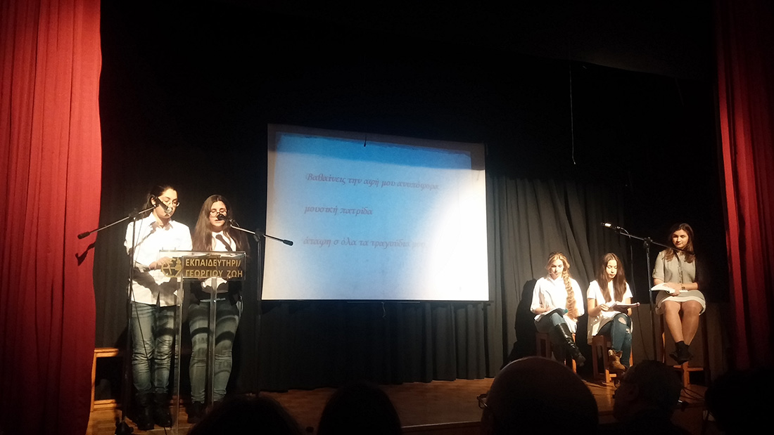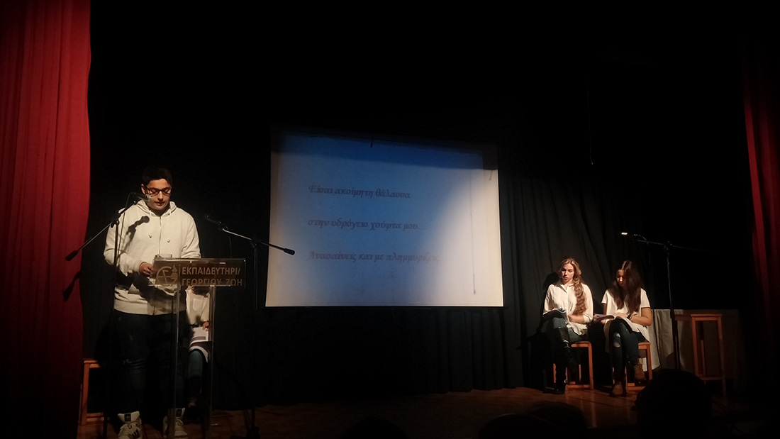 2 Απριλίου 2016… Βραδιά ποιητικής κατάνυξης… Βραδιά κατά την οποία όλοι μας βαπτισθήκαμε στα νάματα της σύγχρονης ποίησης… Τιμώμενο πρόσωπο και πηγή έμπνευσης για την εκδήλωση αυτή ο ποιητής κύριος Μιχάλης Γκανάς, που μας τίμησε με την παρουσία του. Πρωταγωνιστές τα παιδιά μας , τα οποία, χρωματίζοντας το έργο του ποιητή με την προσωπική τους πινελιά, μας έκαναν να βιώσουμε το συναίσθημα, τις ιδέες και την ποιητική δυναμική του έργου, που ανέλαβαν να παρουσιάσουν στο κοινό. Εμείς οι διοργανωτές οφείλουμε να ευχαριστήσουμε τον ποιητή Μιχάλη Γκανά για την παρουσία του στην εκδήλωση, τους μαθητές μας για την άψογη εικόνα και όλους τους παρευρεθέντες, οι οποίοι μας τίμησαν με την παρουσία τους.