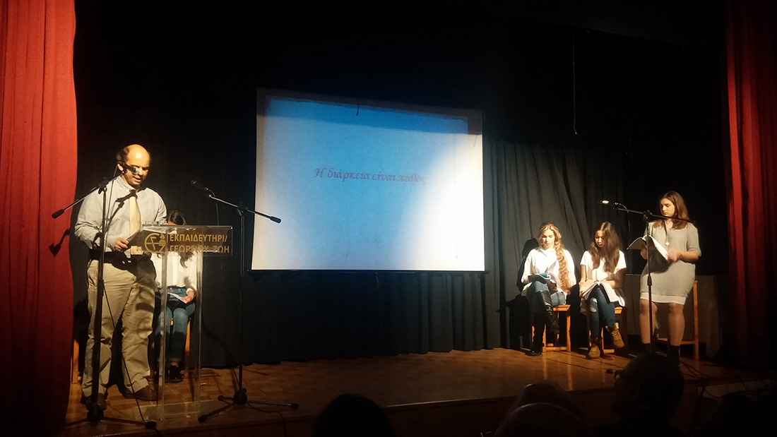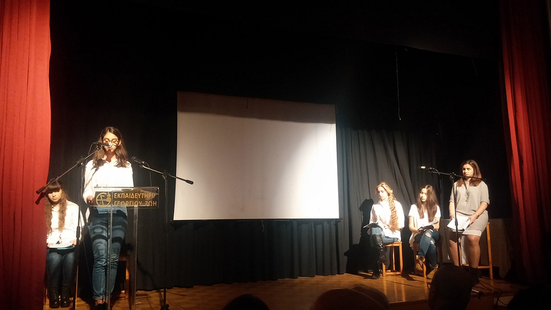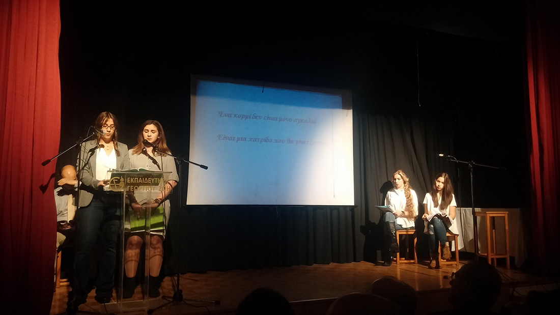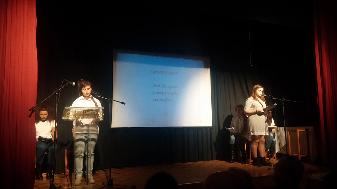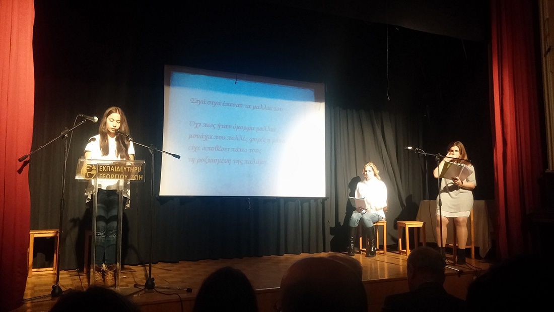 2 Απριλίου 2016… Βραδιά ποιητικής κατάνυξης… Βραδιά κατά την οποία όλοι μας βαπτισθήκαμε στα νάματα της σύγχρονης ποίησης… Τιμώμενο πρόσωπο και πηγή έμπνευσης για την εκδήλωση αυτή ο ποιητής κύριος Μιχάλης Γκανάς, που μας τίμησε με την παρουσία του. Πρωταγωνιστές τα παιδιά μας , τα οποία, χρωματίζοντας το έργο του ποιητή με την προσωπική τους πινελιά, μας έκαναν να βιώσουμε το συναίσθημα, τις ιδέες και την ποιητική δυναμική του έργου, που ανέλαβαν να παρουσιάσουν στο κοινό. Εμείς οι διοργανωτές οφείλουμε να ευχαριστήσουμε τον ποιητή Μιχάλη Γκανά για την παρουσία του στην εκδήλωση, τους μαθητές μας για την άψογη εικόνα και όλους τους παρευρεθέντες, οι οποίοι μας τίμησαν με την παρουσία τους.
