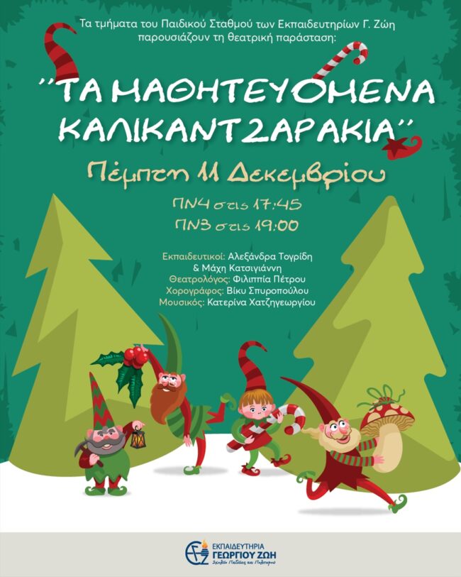 Τα τμήματα του Παιδικού Σταθμού των Εκπαιδευτηρίων Γ. Ζώη σας προσκαλούν στη μαγική θεατρική παράσταση «Τα Μαθητευόμενα Καλικαντζαράκια»!
