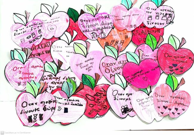 Στη συνέχεια, χωρίστηκαν σε δυάδες και ζωγράφισαν ένα μήλο , μέσα στο οποίο συμπλήρωσαν τη φράση *«Όταν αγαπάμε…»* εκφράζοντας τις δικές τους σκέψεις. Οι υπέροχες δημιουργίες τους διακόσμησαν τον πίνακα ανακοινώσεων, υπενθυμίζοντας σε μικρούς και μεγάλους τη σημασία της αγάπης και της προσφοράς.