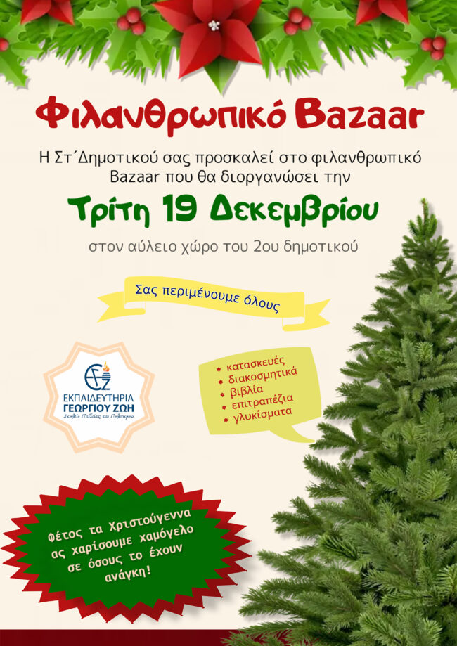 Με μεγάλη χαρά η Στ’ Δημοτικού σας προσκαλεί στο Φιλανθρωπικό Bazaar που θα διοργανώσει την Τρίτη, 19 Δεκεμβρίου 2023. Σας περιμένουμε όλους με πολλές κατασκευές, εξαιρετικά γλυκίσματα, υπέροχα παιχνίδια, φανταστικά βιβλία, γιορτινή μουσική και χορό. Είμαστε αρωγοί σε φιλάνθρωπες προσπάθειες φιλοξενώντας τους γιατρούς του κόσμου και το Make a Wish.