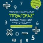 Μαθηματικός Διαγωνισμός «ΠΥΘΑΓΟΡΑΣ» Σάββατο 7 Μαρτίου 2026 Εξ αποστάσεως Για μαθητές Β΄–ΣΤ΄ Δημοτικού & Α΄–Γ΄ Γυμνασίου Ένας διαγωνισμός που αγαπά τα μαθηματικά και όλα τα παιδιά Δηλώσεις συμμετοχής έως 4/3/2026 Μπορείτε να δηλώσετε συμμετοχή εδώ.