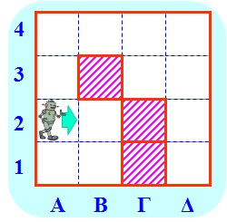 Ένα ρομπότ περπατά στα άσπρα τετράγωνα του δαπέδου, αρχίζοντας από την θέση A2 και κατά την κατεύθυνση που δείχνει το βέλος. Περπατά πάντα προς τα εμπρός, εκτός εάν συναντήσει εμπόδιο, οπότε στρίβει προς τα δεξιά. Τα εμπόδια είναι ο εξωτερικός τοίχος και οι τοίχοι των γραμμοσκιασμένων τετραγώνων. Το ρομπότ σταματά την κίνησή του εάν δεν μπορεί να συνεχίσει προς τα εμπρός αμέσως μετά από μία δεξιά στροφή. Σε ποιο τετράγωνο θα σταματήσει;
