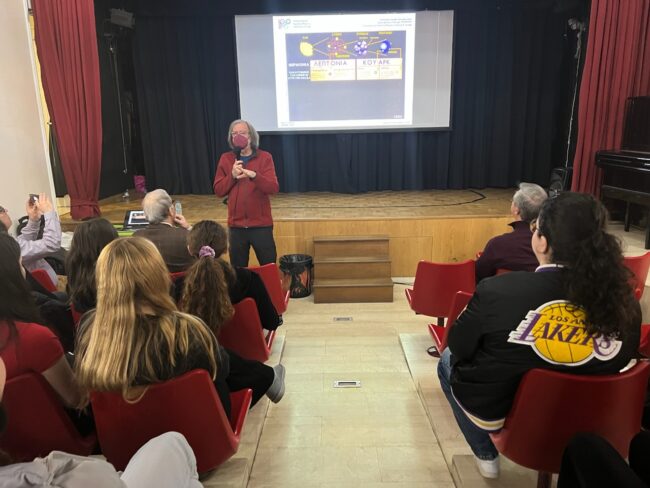 Στα πλαίσια της επίσκεψης ομάδας μαθητών του Λυκείου μας στο CERN, υποδεχθήκαμε στο θέατρο των Εκπαιδευτηρίων τον κ. Νικόλαο Τράκα, καθηγητή του ΕΜΠ, μέλος της ελληνικής επιτροπής CERN και κάτοχο του Βραβείου Εκλαΐκευσης από την European Physical Society.