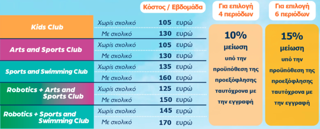 - Για την 8η περίοδο οι τιμές διαμορφώνονται αναλογικά στο κάθε club, στο μαγειρείο και στην δημιουργική απασχόληση, λόγω του ότι είναι συνολικά 7 ημέρες. Για το Sports and Swimming Club, η περίοδος έχει κόστος με σχολικό 200€/εβδ. και χωρίς σχολικό 165€/εβδ. λόγω του ότι θα πραγματοποιηθούν 3 επισκέψεις στη θάλασσα.