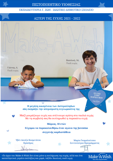 Είμαστε ιδιαίτερα χαρούμενοι που οι μαθητές του Σχολείου μας θα πραγματοποιήσουν την ευχή ενός παιδιού που πάσχει από σοβαρή για τη ζωή του ασθένεια. Η ευχή του μικρού Μάριου θα εκπληρωθεί, και θα παρακολουθήσει έναν αγώνα της Juventus, που τόσο πολύ επιθυμεί.