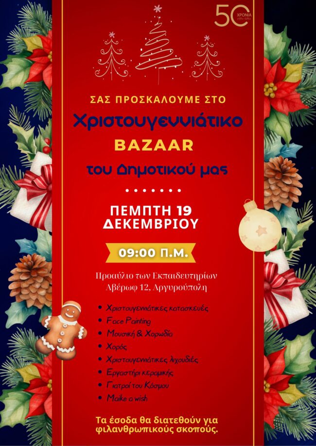 Με χαρά σας προσκαλούμε στο ετήσιο Bazaar που διοργανώνει το Δημοτικό μας Σχολείο! Ελάτε να ανακαλύψετε μοναδικές χειροποίητες δημιουργίες, παιχνίδια, χριστουγεννιάτικες λιχουδιές και πολλά άλλα, όλα φτιαγμένα με μεράκι από τα παιδιά και τους εκπαιδευτικούς μας! Σας περιμένουμε όλους για να περάσουμε όμορφα και να υποστηρίξουμε το σχολείο μας!